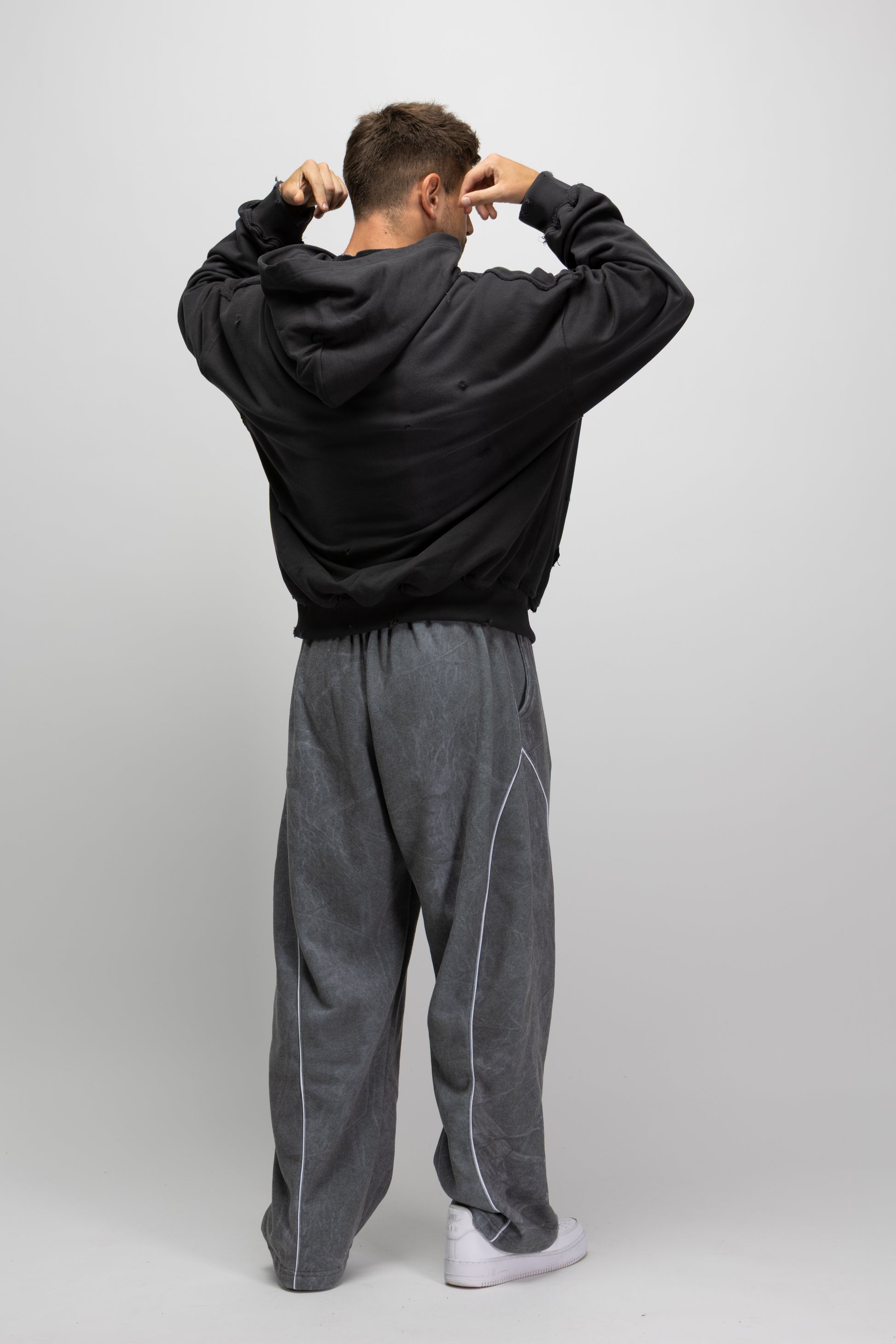 Polerón con cierre de fit holgado y acabado desgastado focalizado. Incorpora costuras expuestas, zonas deshilachadas y roturas controladas que le dan un look rudo y diferente.